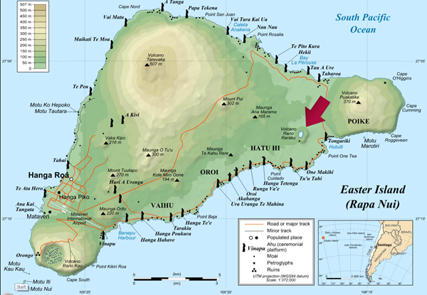 Otro argumento sostiene que sus colonizadores llegaron de la Polinesia. Para descubrir la remota isla de Pascua habrían debido derivar casi hasta la Antártida a fin de encontrar la corriente meridional y evitar la corriente de Humboldt que fluye hacia el oeste. En la isla existen diferentes grupos de estatuas.Doscientas setenta y seis hacen guardia en las laderas del volcán; trescientas están derribadas sobre los ahus que rodean los altos acantilados de la isla, otras están a lo largo de antiguos caminos, y 80 quedaron sin terminar.Estos grupos son diferentes; algunas que estuvieron montadas sobre plataformas funerarias son bustos enormes, sin piernas y a veces alcanzan a 10 metros de altura y 7,6 metros de circunferencia y pesan 20 toneladas; tienen un cilindro, un rojo copete de 1,8 x 2,4 m y se supone que estos “sombreros” fueron extraídos del cráter del volcán Rano Roi.
